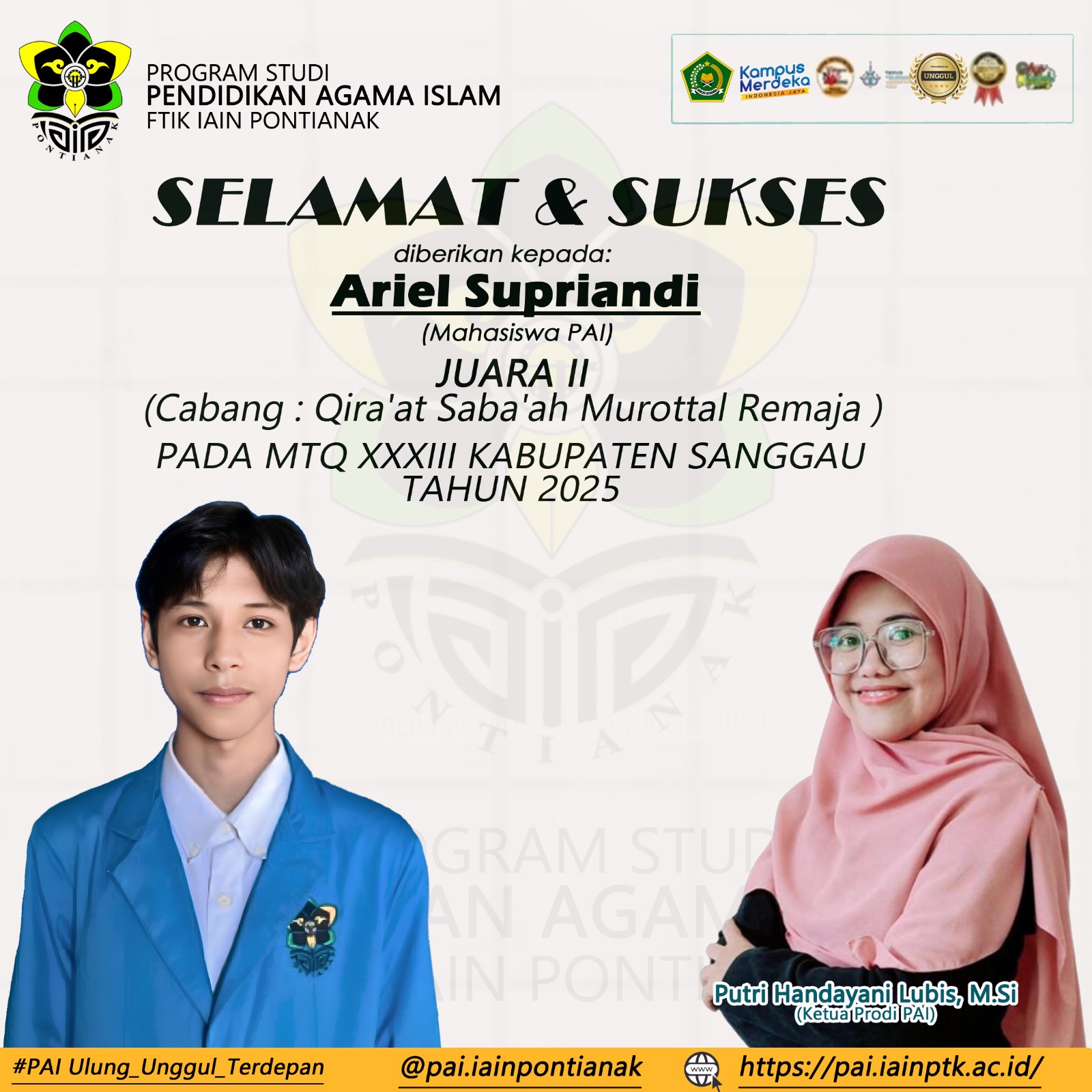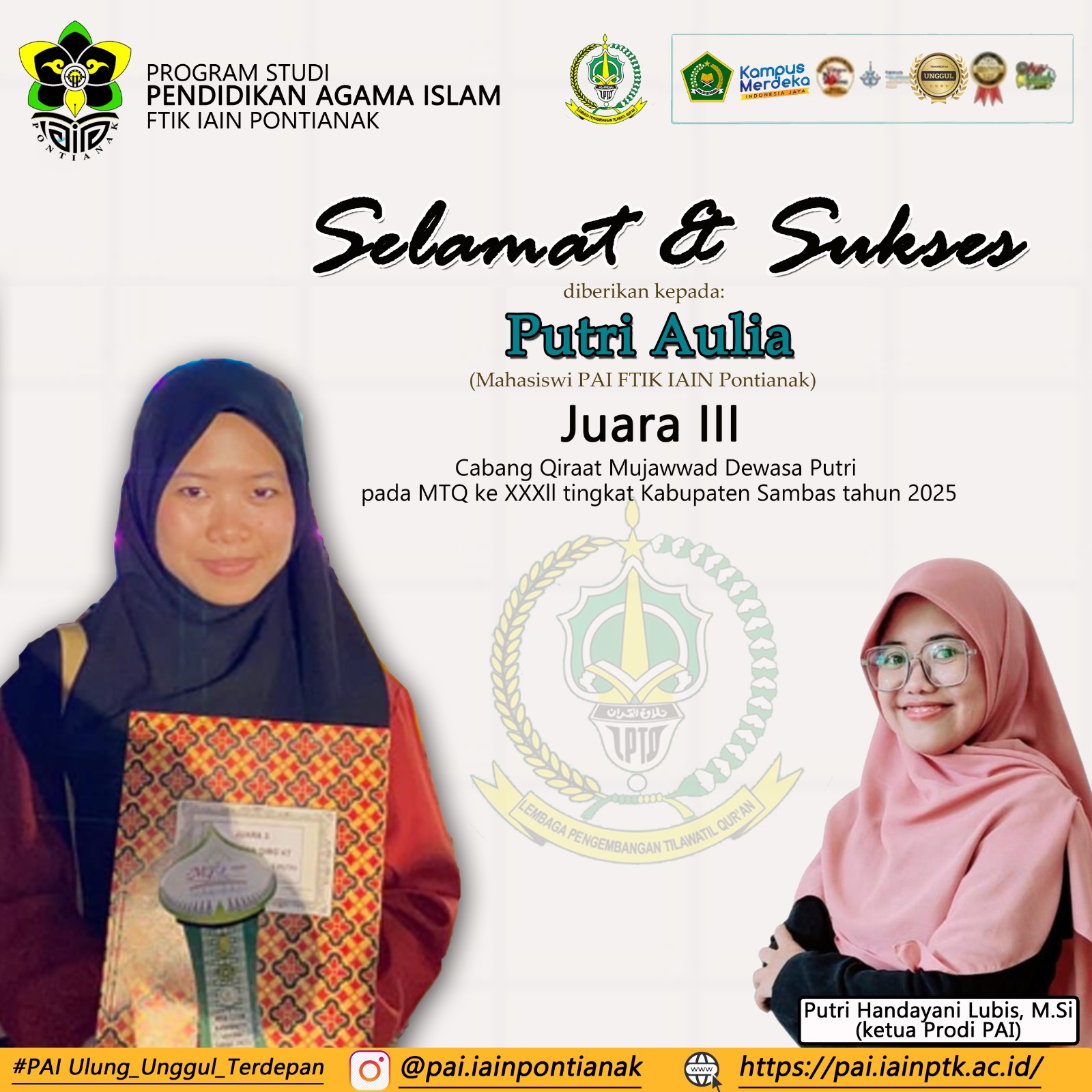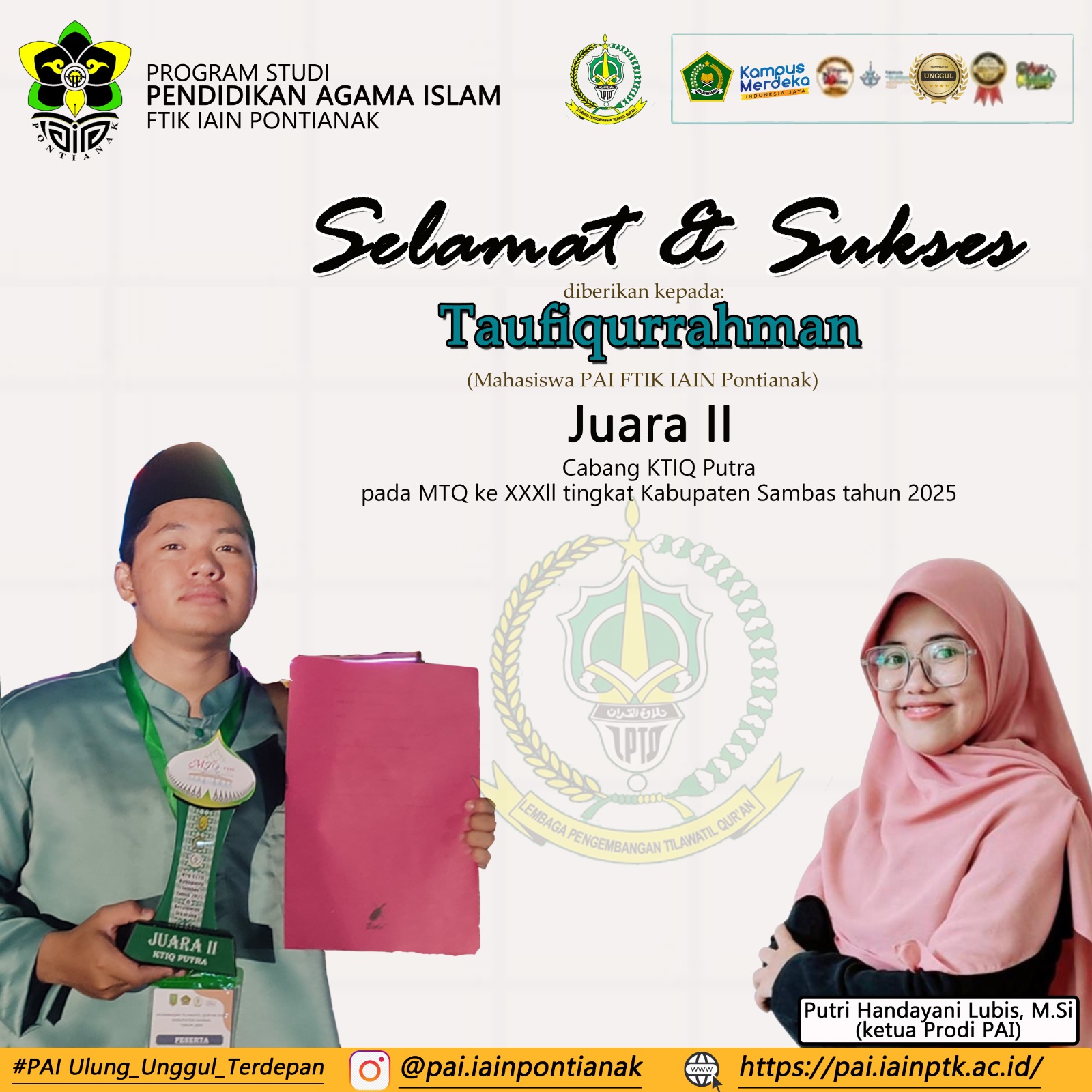 Mahasiswa Program Studi Pendidikan Agama Islam (PAI) di IAIN Pontianak telah menunjukkan prestasi yang membanggakan, terutama di ajang Musabaqah Tilawatil Qur’an (MTQ). Banyak mahasiswa PAI yang berhasil meraih juara dalam berbagai kategori, seperti tilawah, tafsier, dan hifzhil Qur’an, baik di tingkat lokal, dan regional. Keberhasilan ini tidak hanya mencerminkan kemampuan mereka dalam menguasai seni membaca dan memahami Al-Qur’an, tetapi juga menunjukkan kedalaman spiritual dan kecintaan mereka terhadap nilai-nilai agama Islam. Selain itu, prestasi-prestasi tersebut juga menunjukkan kualitas pendidikan di Prodi PAI yang mampu membentuk individu dengan kemampuan akademik dan keagamaan yang seimbang. Mahasiswa PAI IAIN Pontianak terus berkomitmen untuk berkontribusi dalam memperkuat ukhuwah Islamiyah dan memperdalam pemahaman umat terhadap ajaran Al-Qur’an. Prestasi-prestasi ini menjadikan mahasiswa PAI IAIN Pontianak sebagai inspirasi bagi generasi muda untuk terus mengembangkan potensi diri dalam bidang keagamaan, sekaligus memperkuat citra positif prodi di mata masyarakat.
