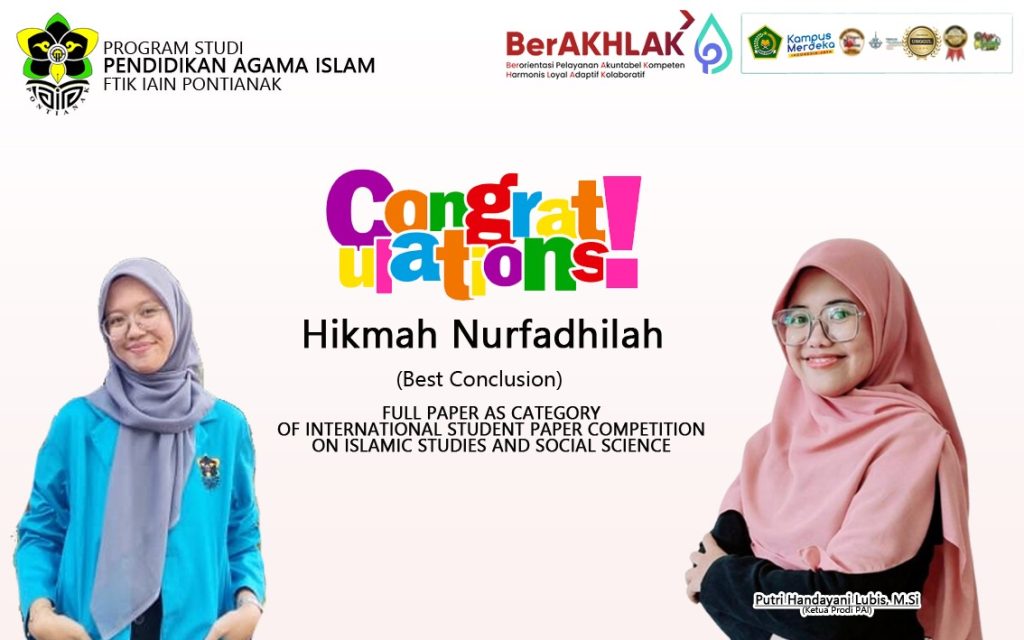 Pontianak, 8 Oktober 2025 — Kabar membanggakan kembali datang dari Program Studi Pendidikan Agama Islam (PAI) Fakultas Tarbiyah dan Ilmu Keguruan (FTIK) IAIN Pontianak. Salah satu mahasiswinya yaitu Hikmah Nurfadhilah, berhasil meraih kategori Best Conclusion II dalam ajang Full Paper as Category of International Student Paper Competition on Islamic Studies and Social Science 2025.